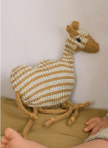 Met deze schattige kameel zal uw baby zich geen seconde vervelen! De kameel wordt gebreid in rechte tricotsteek en gestreepte rechte tricotsteek met breinaalden nr.3,5. De ogen worden in spansteek geborduurd met zwarte draad. De pootjes worden gepunnikt.