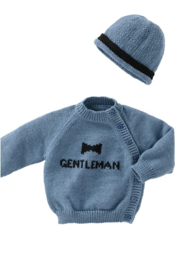 De kleine gentleman gaat op ontdekkingsreis. Om in de smaak te vallen bij zijn vrienden, moet hij goed gekleed gaan. Het geheel wordt gebreid in rib 1/1, rechte tricotsteek, jacquard en rijstkorrelsteek met breinaalden nr.2,5 en 3 of met de breimachine.