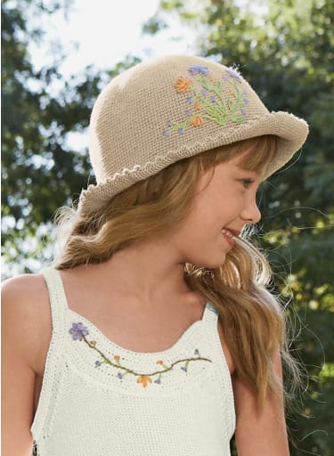 Dit kleine armbandje en hoedje passen perfect bij een jurkje. Ze worden gehaakt met haakpen nr.1,75 en 3. Voorzie een knoop om het armbandje te sluiten.